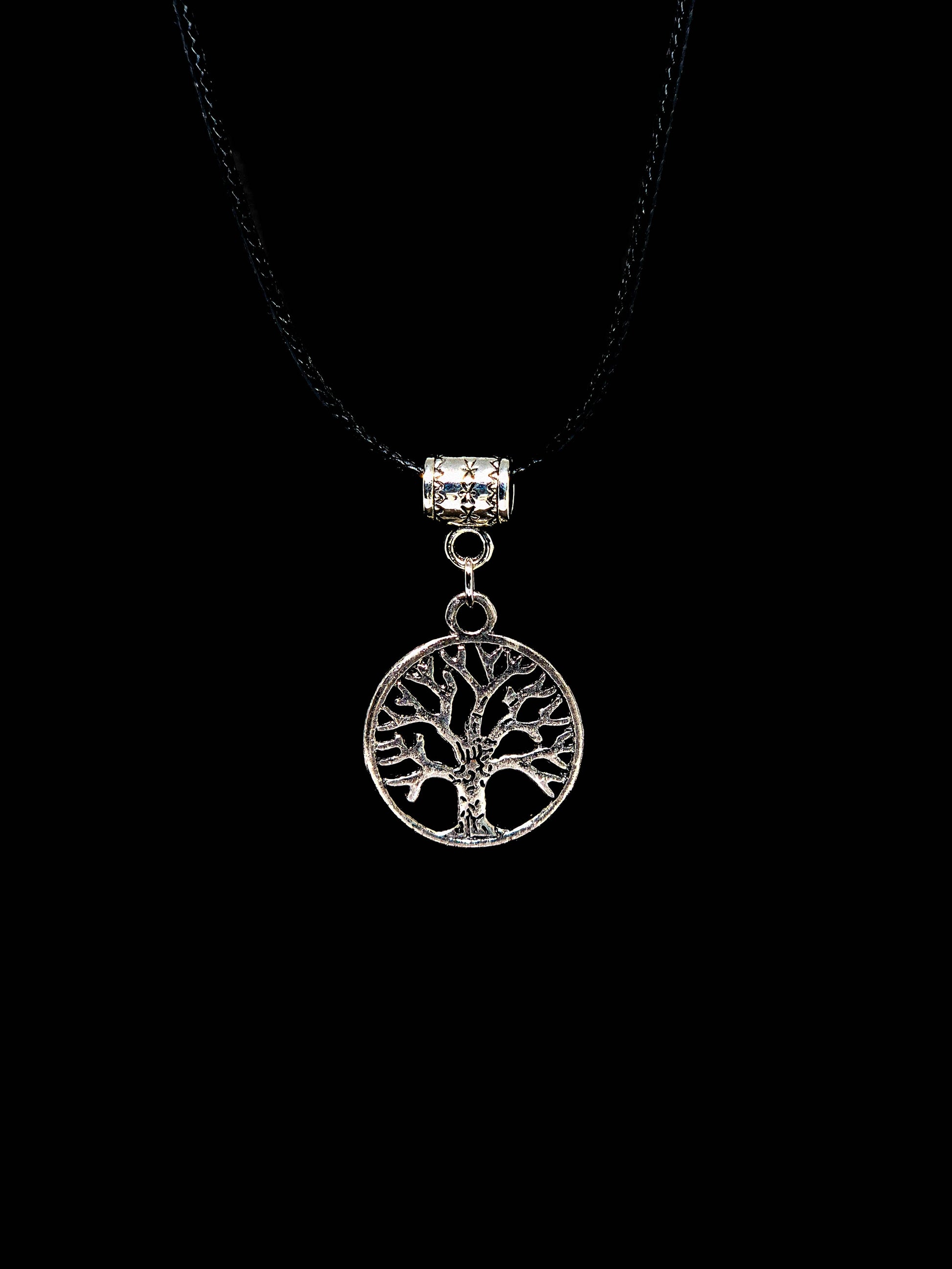 Hängsmycket föreställer Yggdrasil, livets träd, med grenar som sprider sig inom en cirkel. Kedjan är en svart snodd som ger en kontrasterande bakgrund till det intrikata metalliska hängsmycket. Materialet är zinklegering, vilket ger halsbandet både hållbarhet och en elegant look.