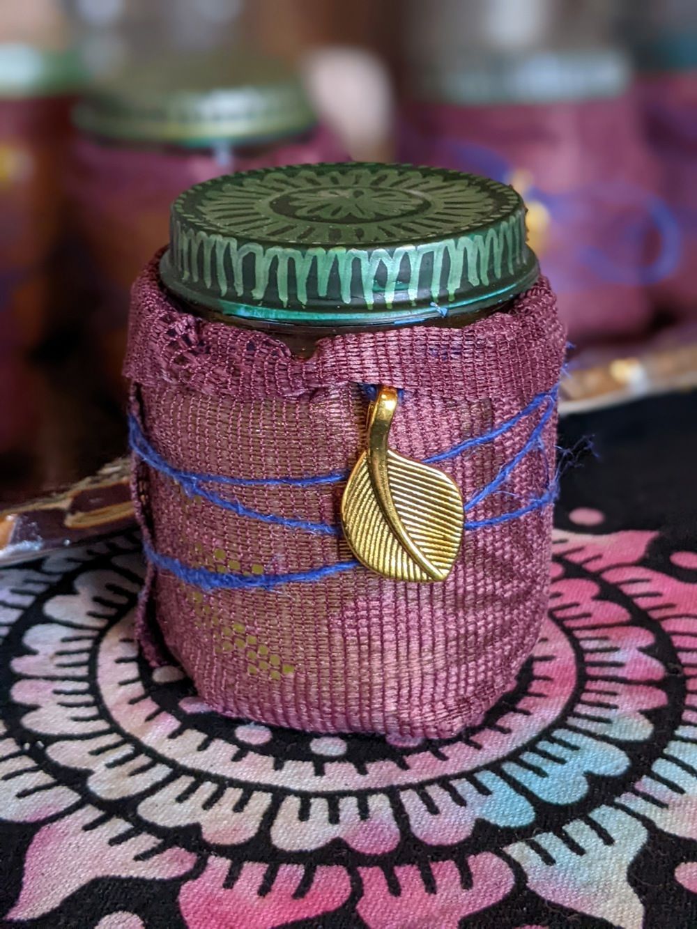 Design: Ljuset är vackert inslaget i rosa tyg och dekorerat med en gyllene lövcharm, knuten med blå och lila trådar för en extra touch av elegans.